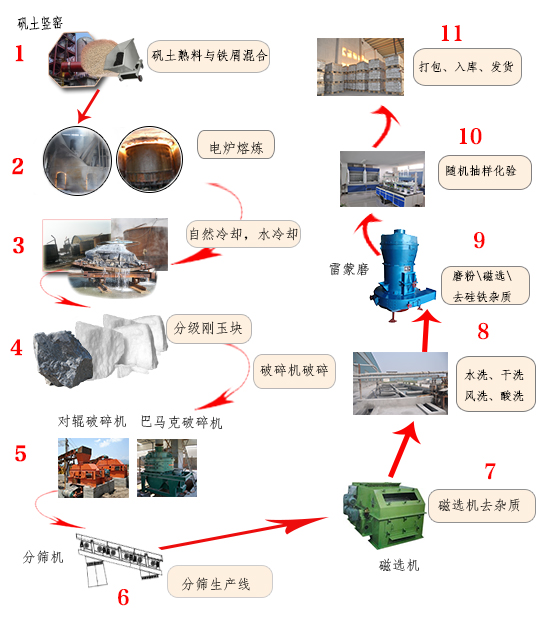將礬土熟料、氧化鋁粉等原料按一定的配方和比例混合,經過電弧爐通電高溫冶煉成為剛玉原塊。