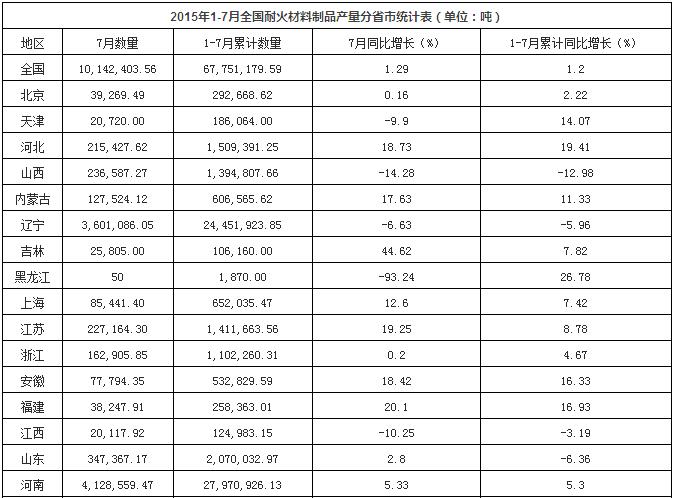 導讀: 2015年1-7月全國耐火材料制品產量分省市統計如下: