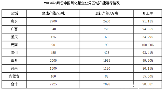 2017年3月份國內(nèi)氧化鋁企業(yè)產(chǎn)能運(yùn)行分析