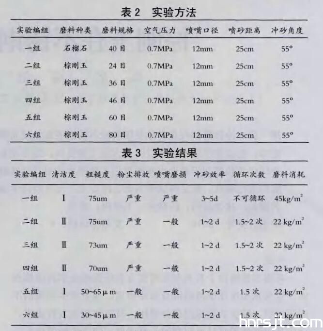 實驗設備與方法:環保式自動沖砂機,12mm二次進風型噴嘴,粗糙度測試儀,600mm*800mm不銹鋼板6塊,石榴石和棕剛玉磨料各500kg;選用國內船廠常用規格石榴石磨料和不同規格棕剛玉磨料進行實驗對比,分別如表2和表3所示。