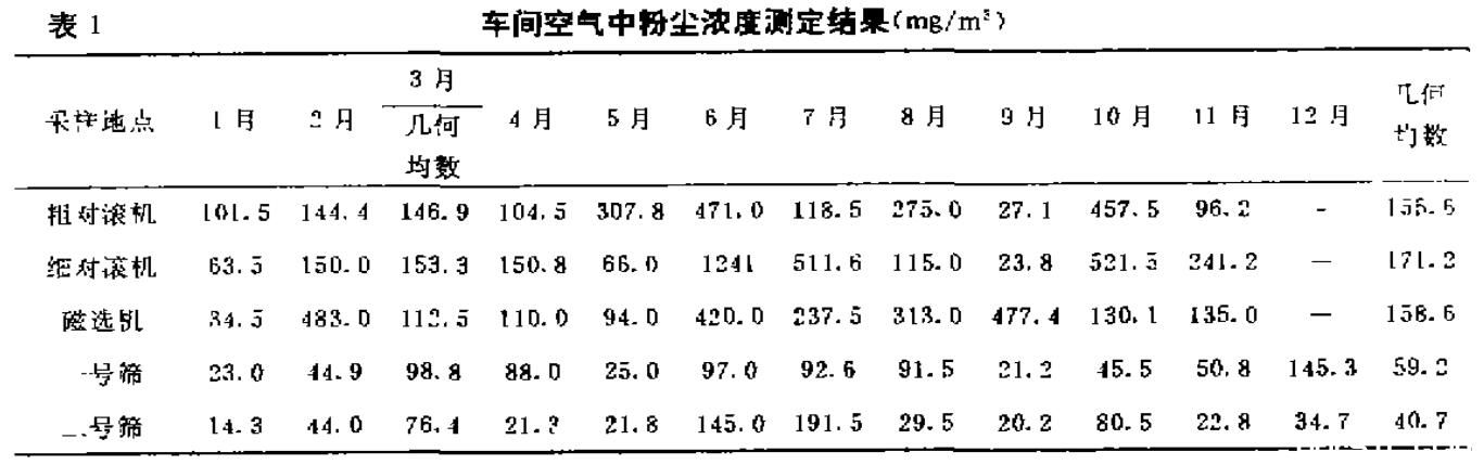 選五個測塵點。固定每月中旬測塵一次,共測12個月.其中三月份連續測4天,計算幾何均數.結果見表1